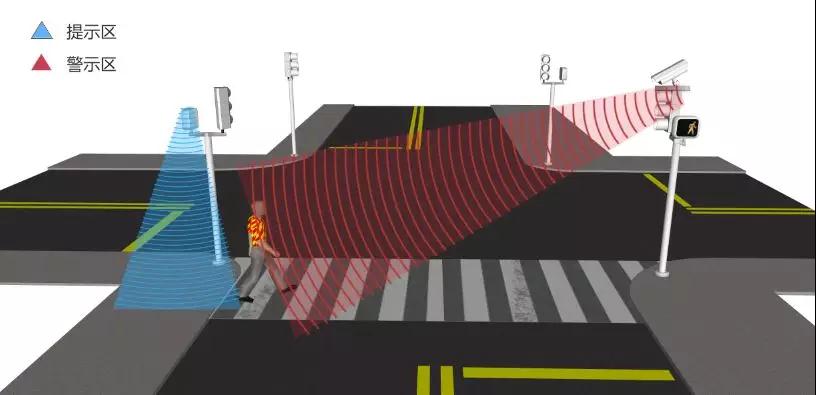 在交通信號燈紅燈亮起時,同時觸發兩個定向語音警示單元:集成在行人等候區的定向語音警示單元可播放道路交通法規、核心價值觀等提示行人不要闖紅燈;集成在人行道另外一端的定向語音警示單元,在接收到行人闖紅燈違規信號時實時發出僅且輻射整條人行通道的警示聲,警示違規行人退回等候區。